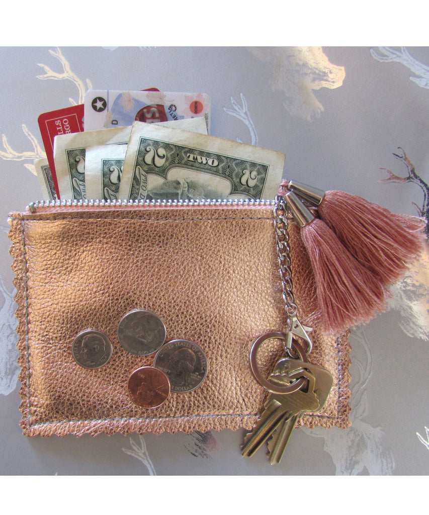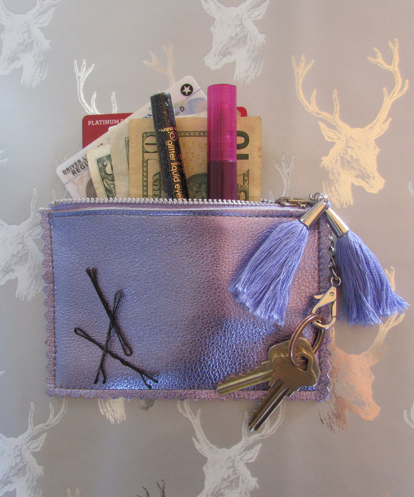 Night out and want only the essentials? The tara metallic leather card wallet holds what you need for an evening including a clip for your keys. Sleek profile with a hint of glamour.